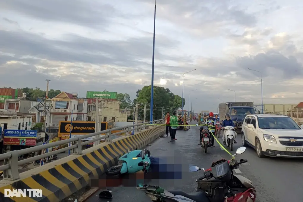 When the electric motorbike reached the overpass at the 550 intersection (Binh Hoa ward, Thuan An city), it collided with a tanker truck with license plate 14C-143.21 driven by Trinh Hung Sy (26 years old, from Binh Dinh) traveling in the same direction on the left.