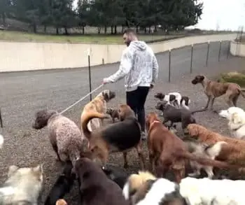 Introductions are handled with care. Leo meets Scooter, a calm and friendly dog, followed by slow introductions to the rest of the pack through crates. Sniffing. Observing. Processing. It is clear that this moment matters to everyone involved. The excitement is genuine, and even surprising, because dogs like Leo rarely come along.
