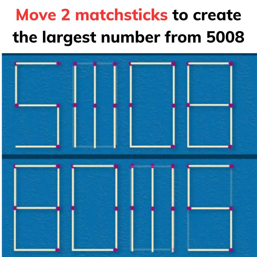 RelaxMove 2 matchsticks to create the largest number from 5008Published: 07/02/2025 16:45| CommentsPhoto: Onplusnews.net1 of 1Answer: very simple, do as shown and you will get the 2 largest numbers. Share this article:More Related StoriesWho is a genius to find the missing number in the following table?Plant these 3 flowers in front of your house to attract wealth and luckI challenge you to find the only mistake in the photoMove 2 matchsticks to create the largest number from 5008