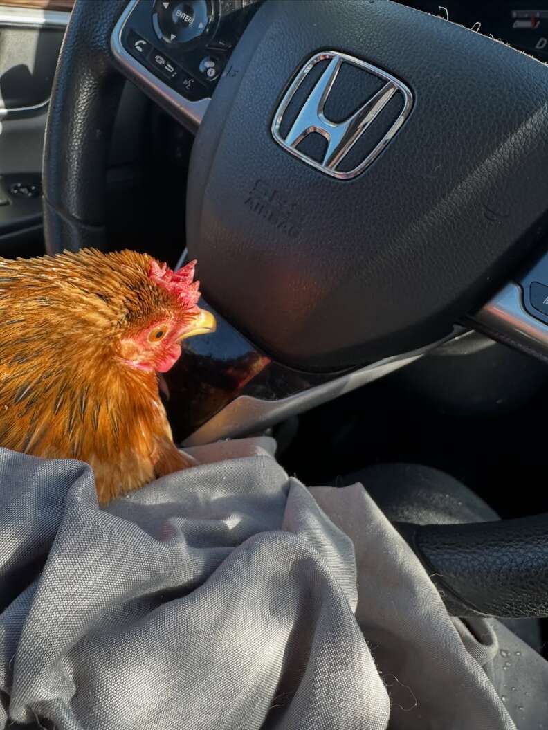 The woman gently scooped the chicken up and rushed back to her car. Inside the vehicle, warmth began slowly seeping back into the hen’s fragile body.